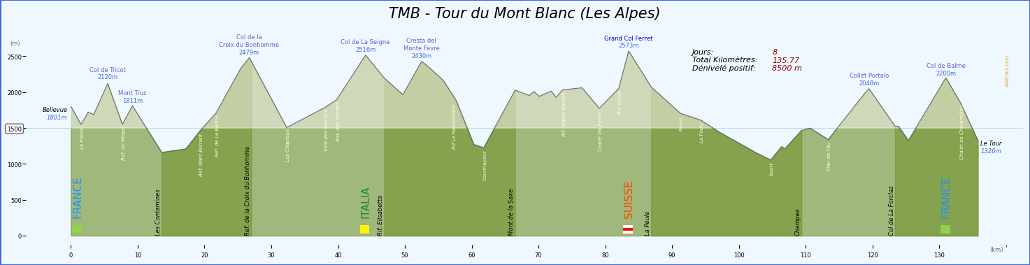 Elevation profile poster for the TMB in its 8-day version, a hut to hut loop around the Mont Blanc, the Alps and Western Eureope’s highest mountain. This is Europe’s most popular mountain trek and one of the world’s favourites among long distance hikers. Very popuylar and with an international atmosphere, with unforgettable vistas of glaciers and granite peaks.